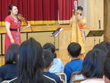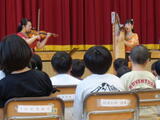 今日は「アルパ」という楽器とヴァイオリンの演奏を鑑賞するコンサートが体育館で行われました。「アルパ」はパラグアイなどで演奏されているハープに似た楽器です。演奏の合間に曲や楽器,素敵な衣装についてのお話しもありながら,ジブリやディズニーの曲,教科書にも載っている秋の季節の曲などたくさん聴かせていただきました。生演奏を全校児童で思う存分に味わい素晴らしい時間を過ごすことができました。